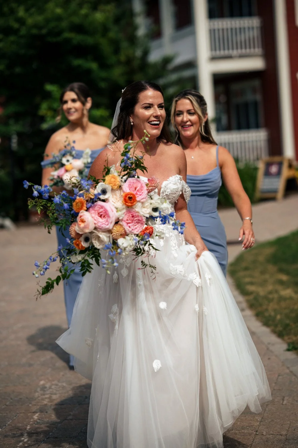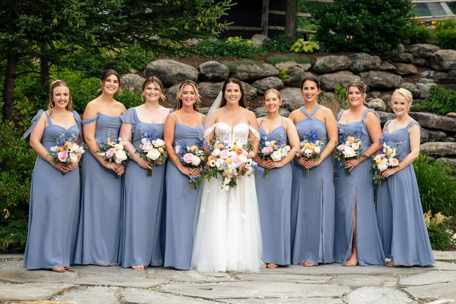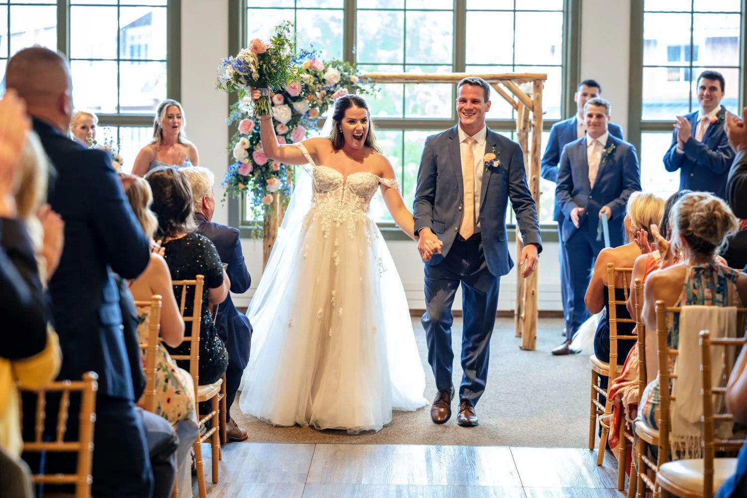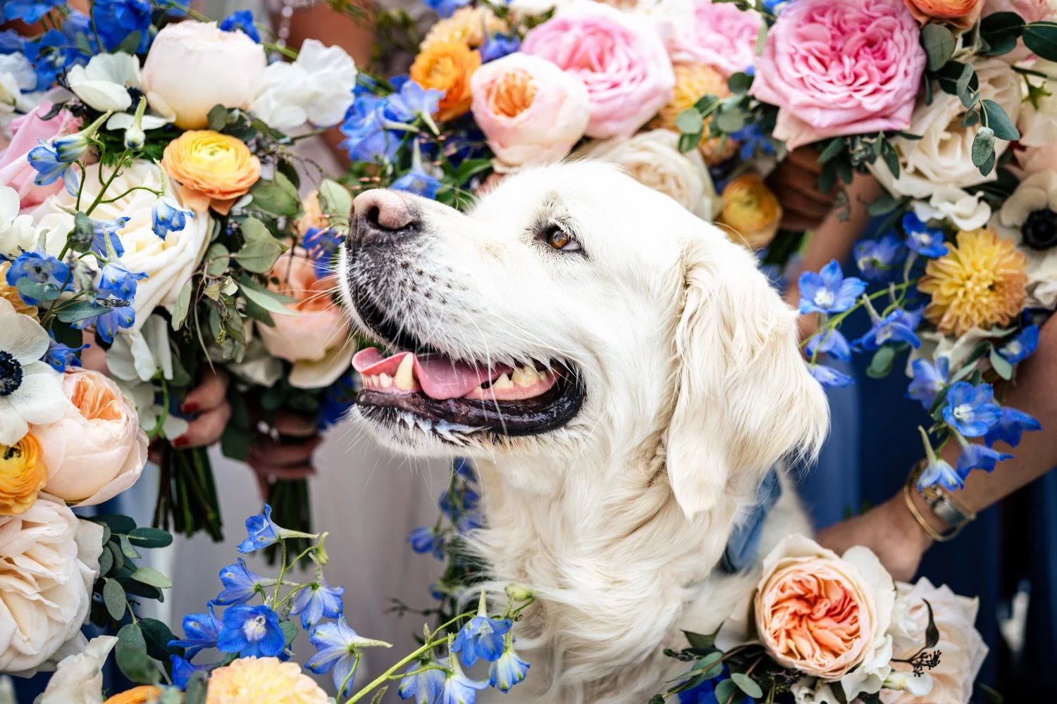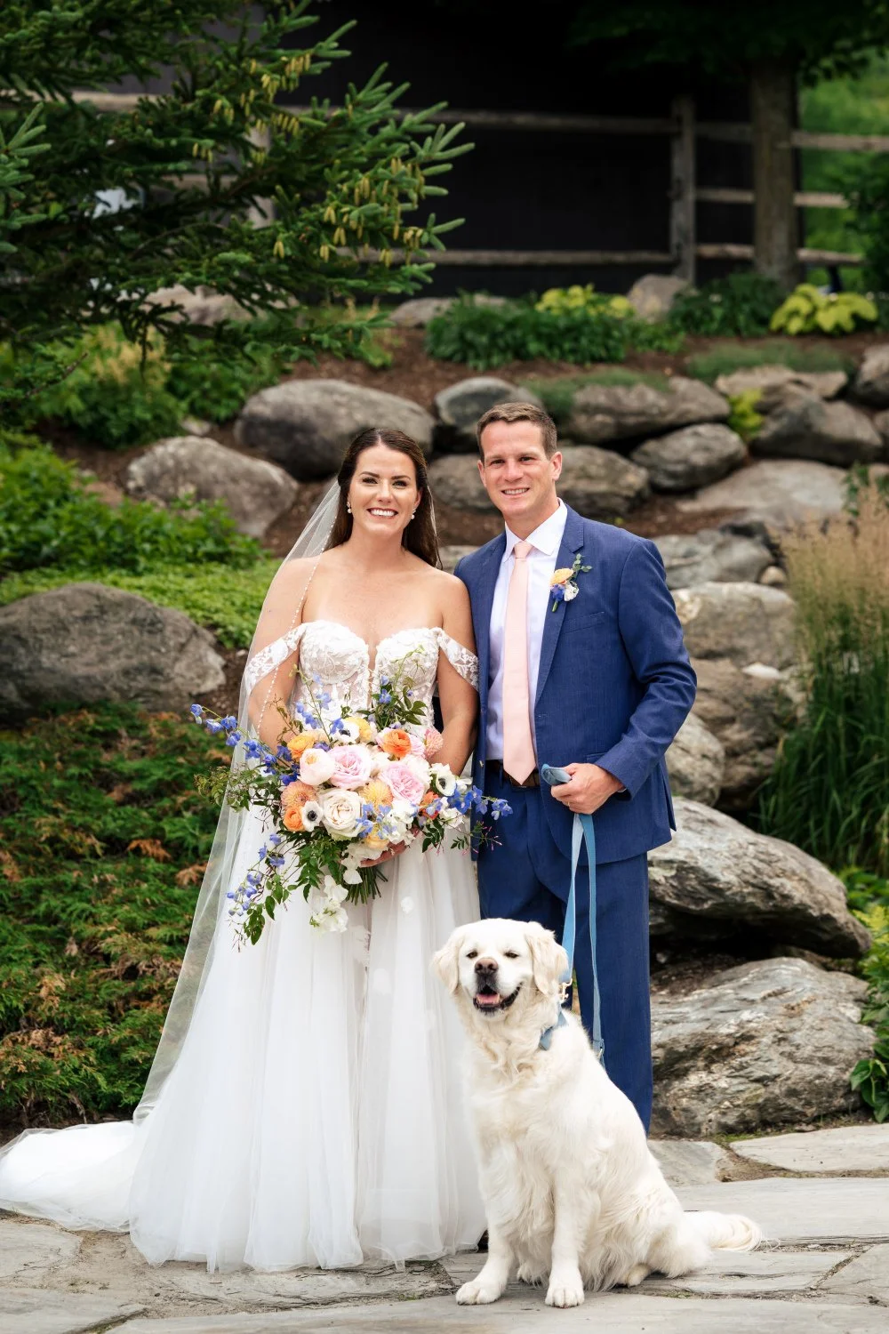 A full weekend of summer celebration, filled with pastel rainbow florals and colorful blooms under warm sunshine. Every detail was joyful and playful, including their adorable golden lab, making this a truly unforgettable wedding.
