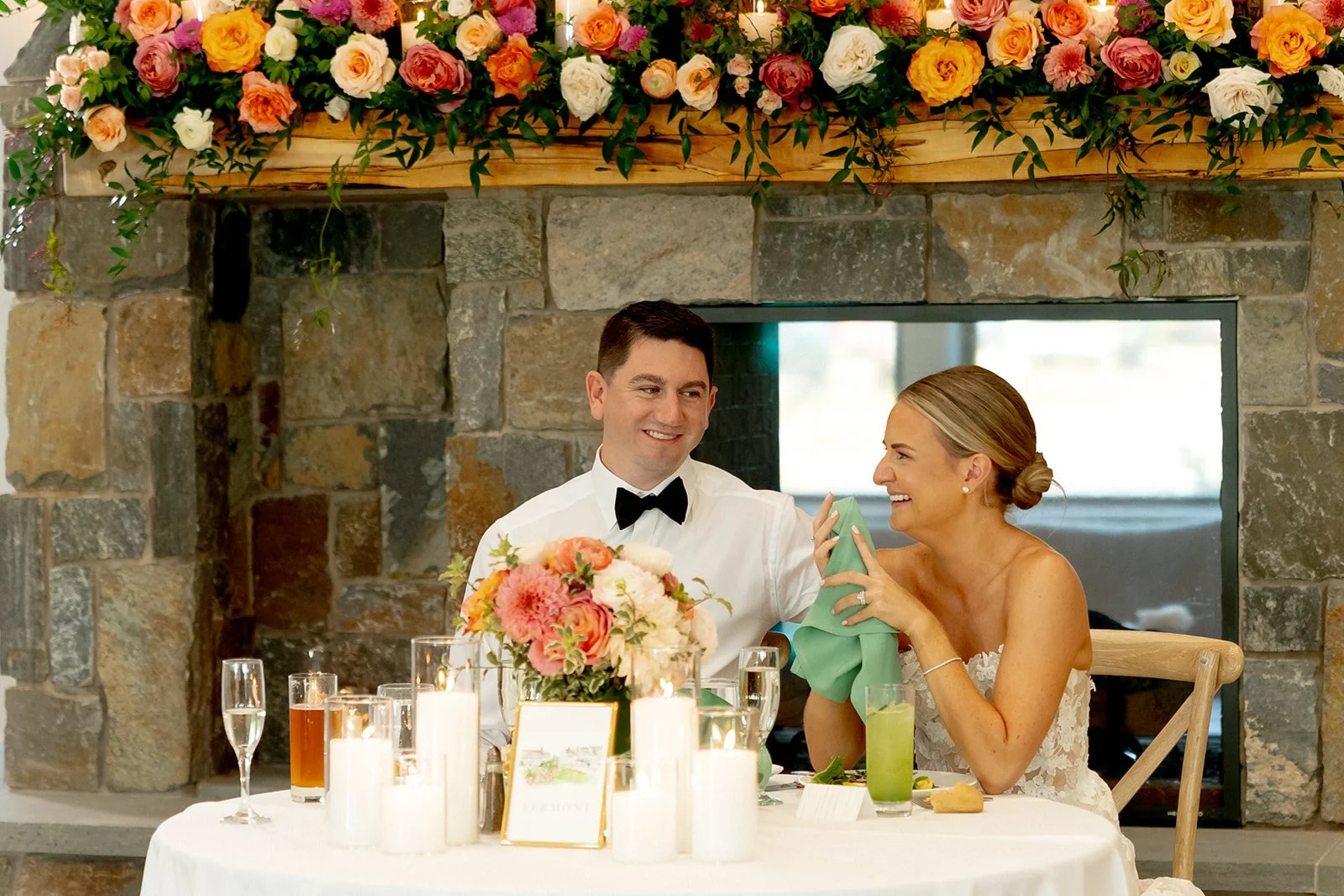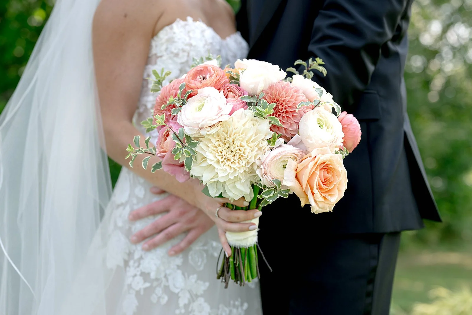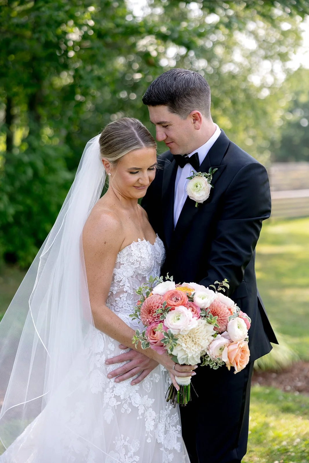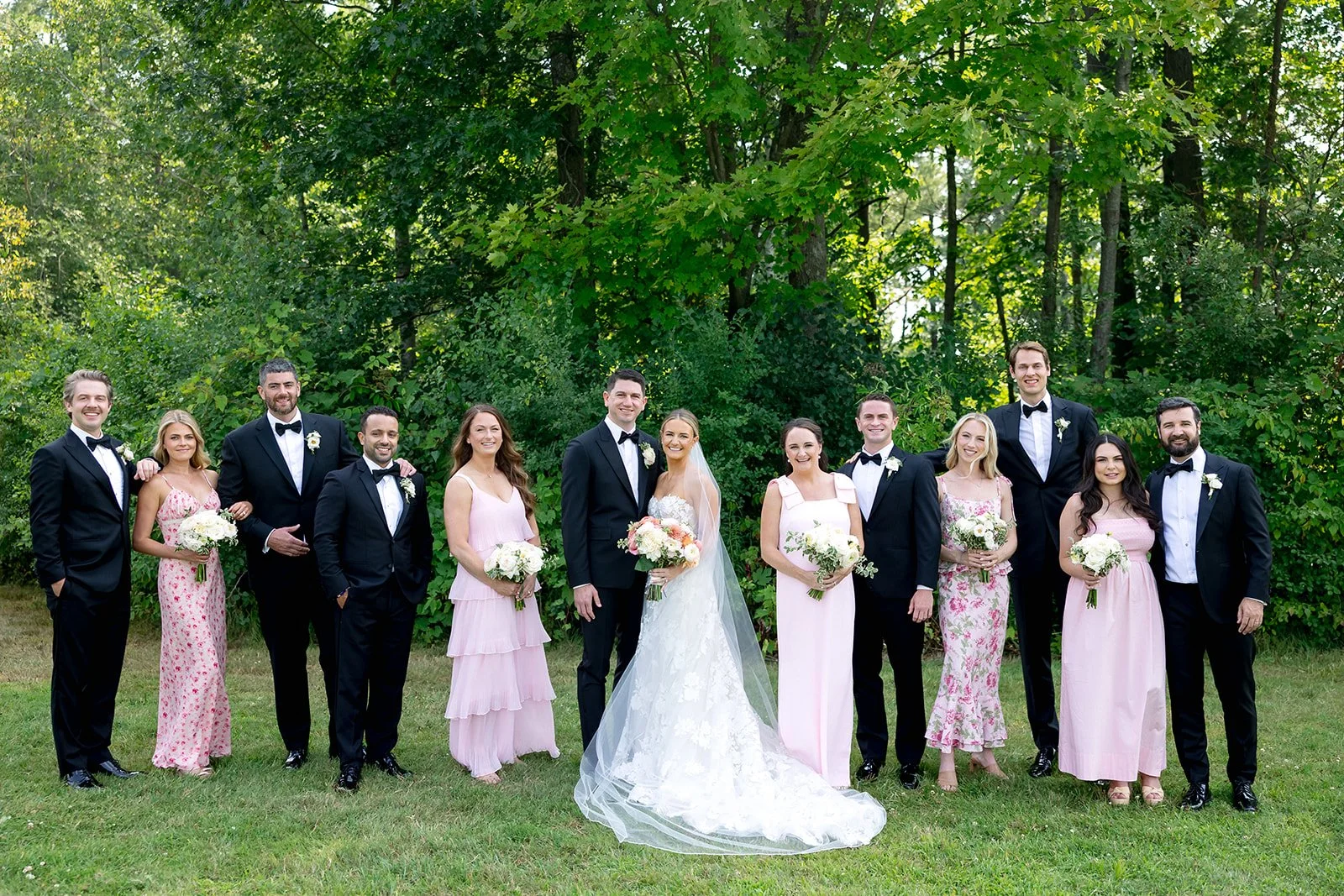 A bright, warm summer day in Vermont set the stage for an elegant affair with natural, airy florals in soft peach and blush, accented with vibrant mantel flowers. Every bouquet and arrangement brought light, joyful elegance to their celebration.