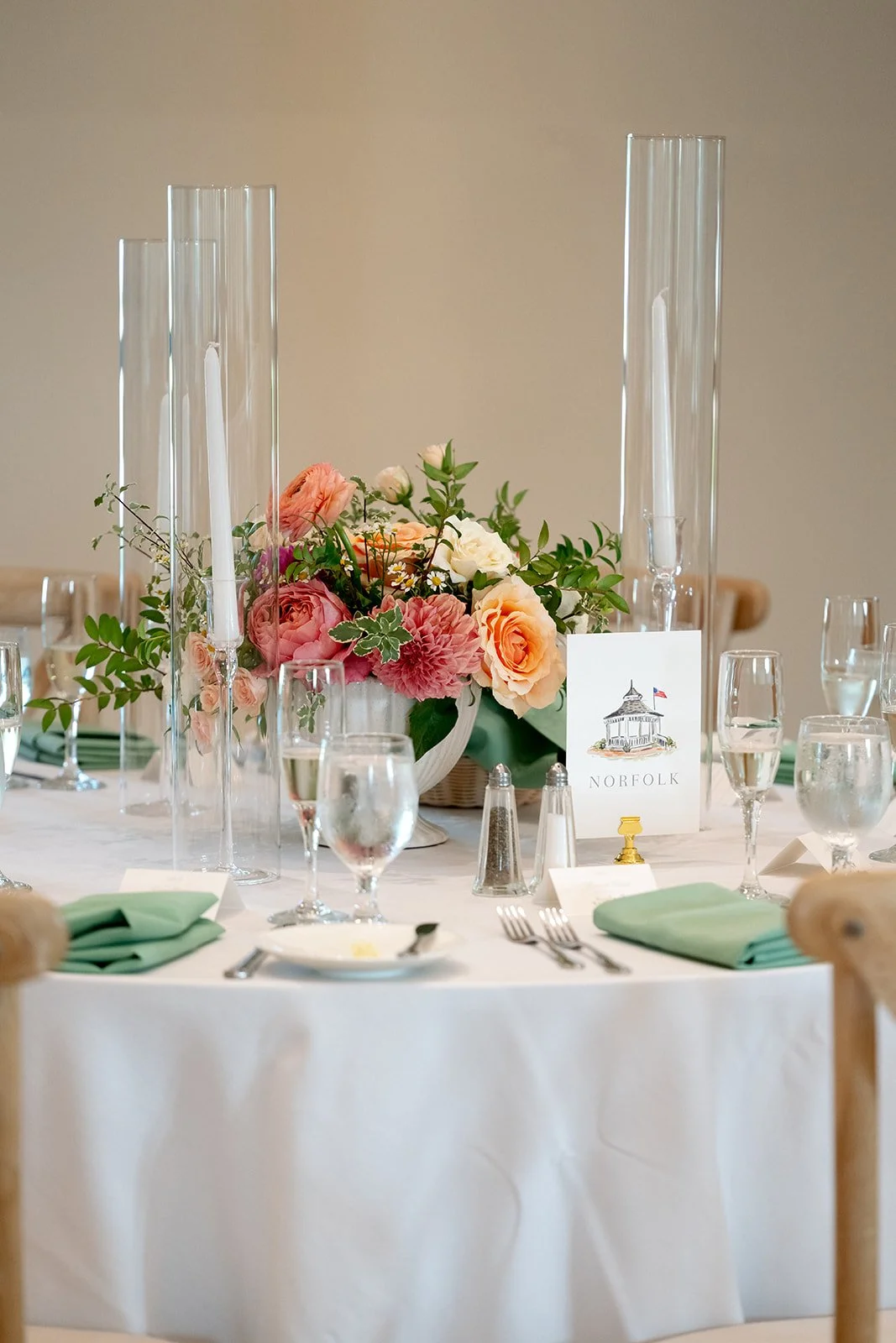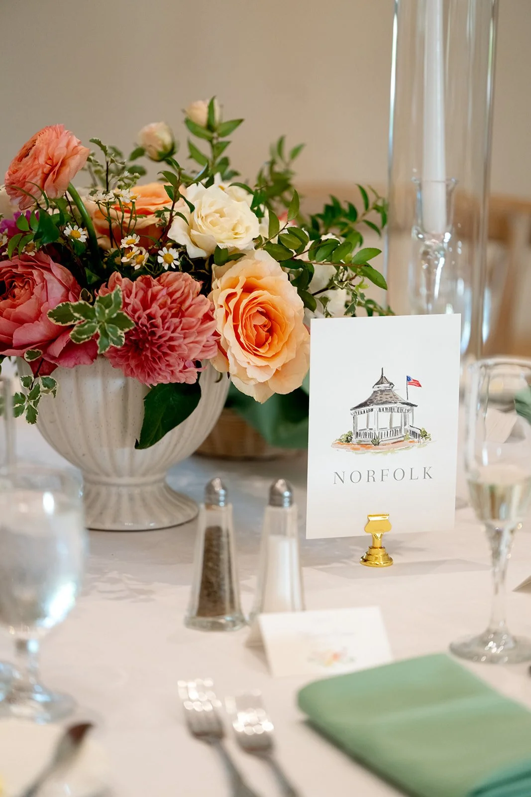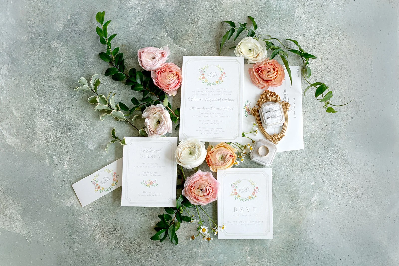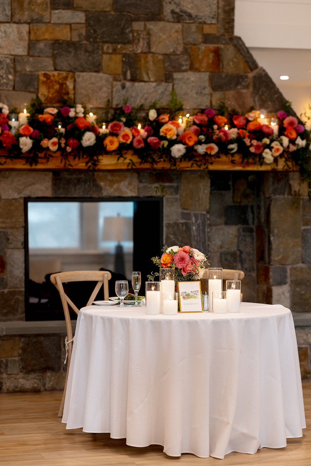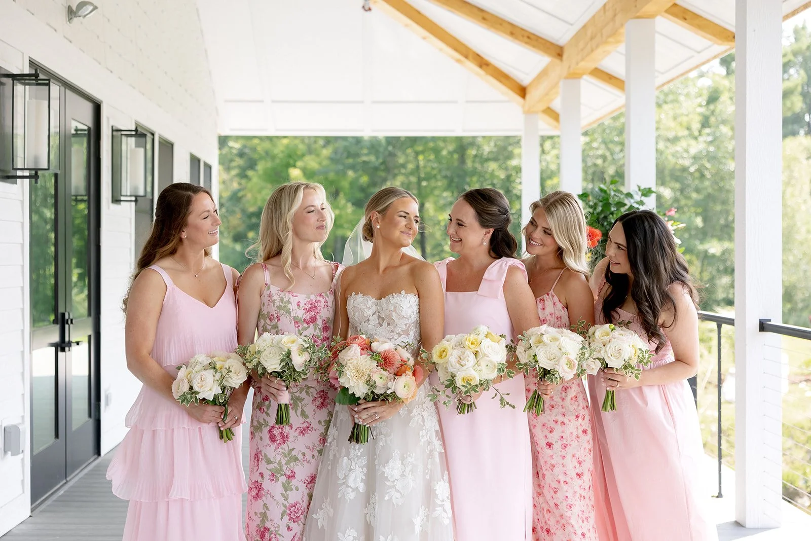 A bright, warm summer day in Vermont set the stage for an elegant affair with natural, airy florals in soft peach and blush, accented with vibrant mantel flowers. Every bouquet and arrangement brought light, joyful elegance to their celebration.
